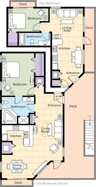 The 2 Bedroom Deluxe comes in the following bed configurations: King, 2 Twins, Queen sofa bed (Bay Point); King, Double, Queen sofa bed (The Village) and King, Queen, Queen sofa bed (Marsh Point)