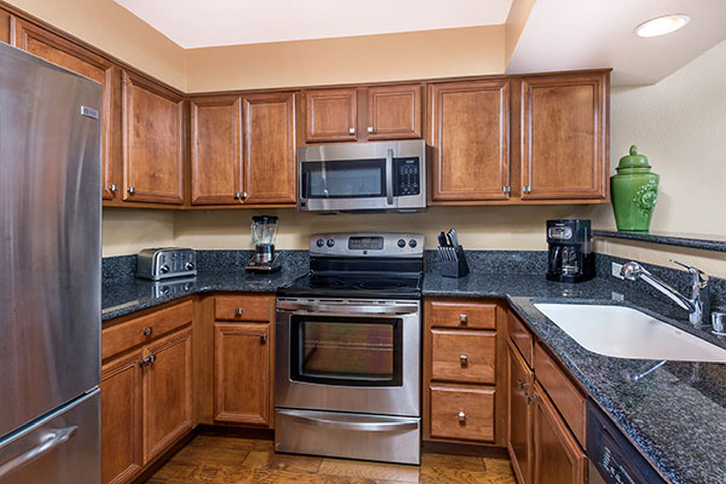 Offering spacious one-, two-, and three-bedroom resort suites that comfortably sleep four to eight guests and range from 846 to 1,255 square feet. Suites feature private bedrooms with one king bed in the master, one queen bed or two twin beds in the guest rooms and a double Murphy bed in the living area. You will appreciate the economy of a full kitchen and the convenience of a washer/dryer in each suite. Plus, a separate living/dining area, whirlpool tub, gas fireplace for chilly nights and a private balcony/terrace for stargazing or grilling out on your barbecue grill.