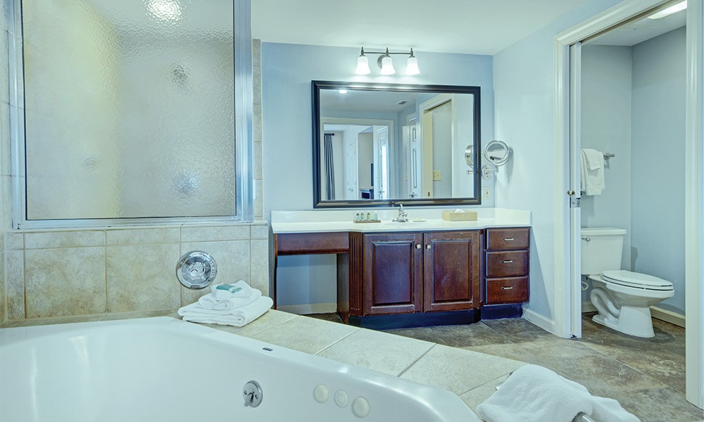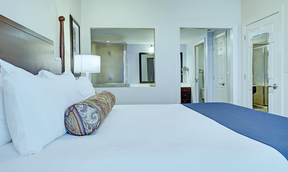 At Wyndham Old Town Alexandria, these spacious one-bedroom resort suites comfortably sleep four guests. Suites feature a private master bedroom with one king bed and a queen sleeper sofa in the living area. You will appreciate the privacy of separate bedrooms and the economy of a mini kitchen. You will also enjoy separate living/dining areas with TVs throughout.