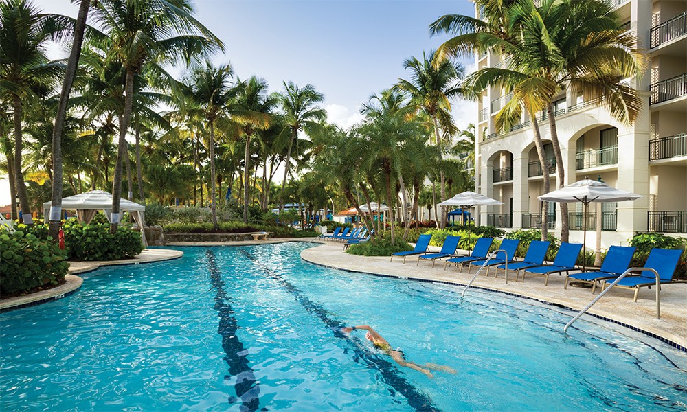 Margaritaville Vacation Club by Wyndham - Rio Mar is tucked within the stunning, 500-acre Wyndham Grand® Rio Mar Beach Resort & Spa. Lushly landscaped in harmony with the island and neighboring El Yunque Rainforest, the resort features miles of hiking, biking and jogging trails, beach volleyball, two championship golf courses, tennis, a fitness center, water sport rentals and much more. When the music calls, head to your tropical oasis complete with luxurious pools surrounded by cabanas, swim-up bar, hammocks, fire pit, hot tubs and 5 o'Clock Somewhere Bar — built exclusively for Margaritaville Vacation Club! Once you've indulged in just about every delight here — including luxury spa treatments, casino action, boutiques and 10 different restaurants, lounges and entertainment venues — celebrate doing absolutely nothing at all as you stake out a spot on the mile-long stretch of golden beach for a well-deserved nap.